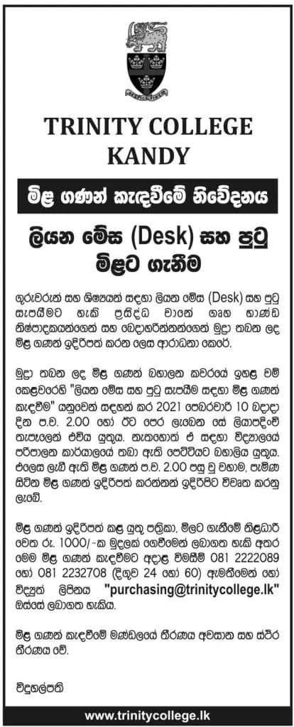 Tender forms and other details can be obtained from the Purchasing Officer for a fee of Rs. 1,000/-; enquiries pertaining to this tender can be obtained by calling 081 2222089 or 081 2232708 (ext 24 or 60) or by email to “purchasing@trinitycollege.lk“.