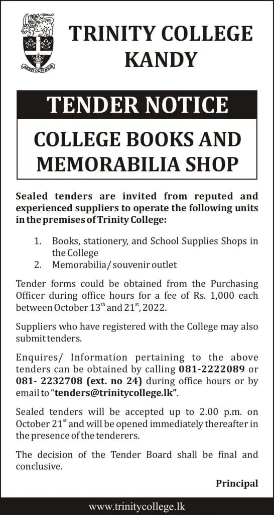 Enquiries/ Information pertaining to the above tenders can be obtained by calling 081-2222089 or 081-2232708 (ext. no 24) during office hours or by email to “tenders@trinitycollege.lk”