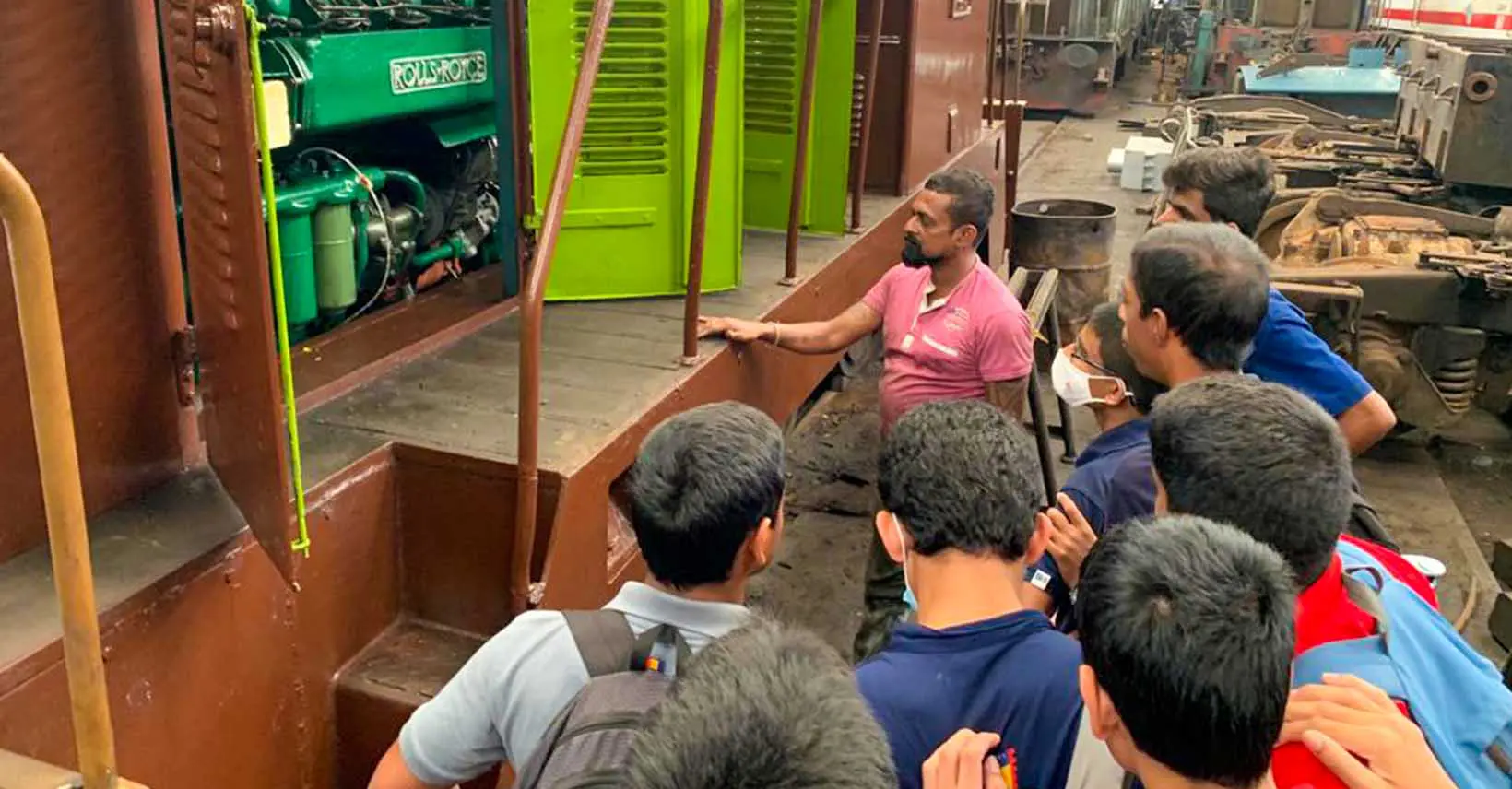 Moving on to Workshop 27, the students encountered large rail engines and observed mechanical engineers and technicians dismantling and repairing them. They saw two types of engines: diesel-powered mechanical engines and diesel-powered electrical engines.