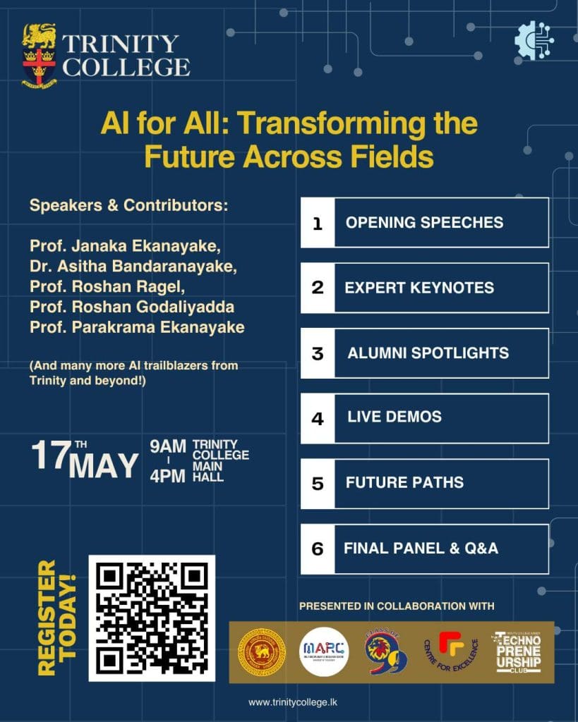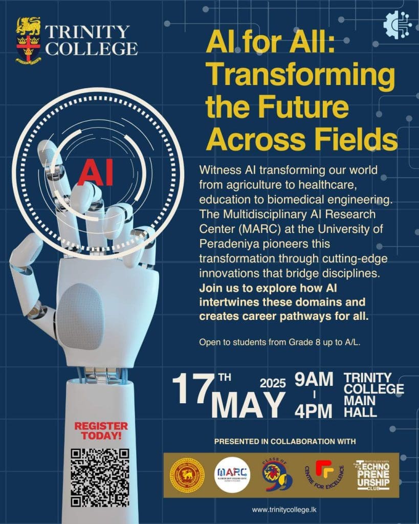 Trinity College is set to host a groundbreaking event, “AI for All: Shaping the Future for Every Field,” on May 17th at the Main Hall from 9 AM to 4 PM. Organized by the TCK Batch of 1999, the Center for Excellence, and the Technopreneurship Club, with expert support from the Multidisciplinary AI Research Center (MARC) of the University of Peradeniya, this initiative marks a significant step in the college’s mission to empower students with cutting-edge knowledge.