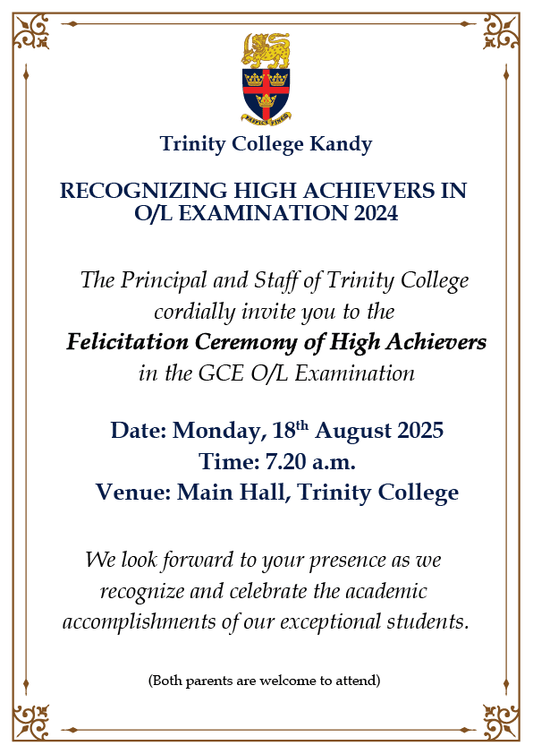 Trinity College, Kandy, extends a warm invitation to the parents and guardians of our outstanding students to join us for a special Felicitation Assembly, where we will honour the high achievers of the GCE O/L Examination 2024. This occasion marks a celebration of academic excellence and the hard work, dedication, and commitment shown by our students.