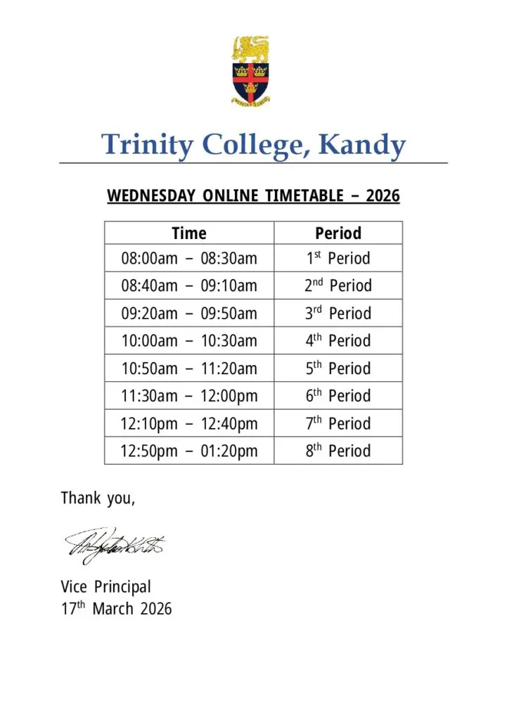 In line with the National Policy, starting from 18 March 2026, classes will be conducted online every Wednesday until further notice. Kindly ensure that your children attend the sessions as per the schedule. For any technical assistance, please email 365@trinitycollege.lk or contact the IT Department (0706901580) or the respective class teacher.