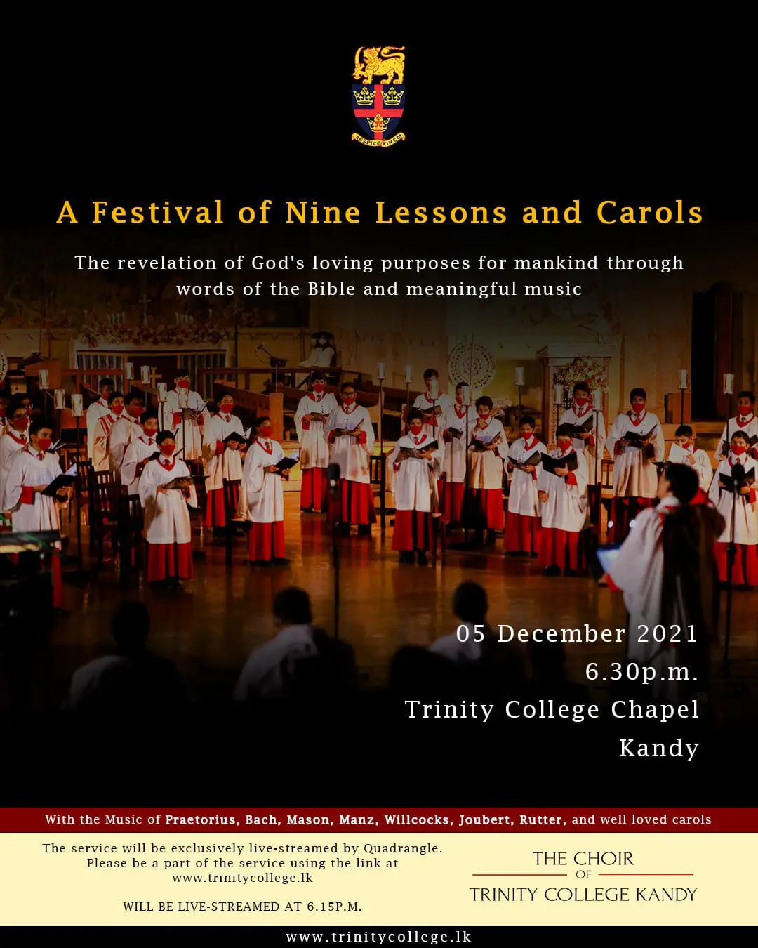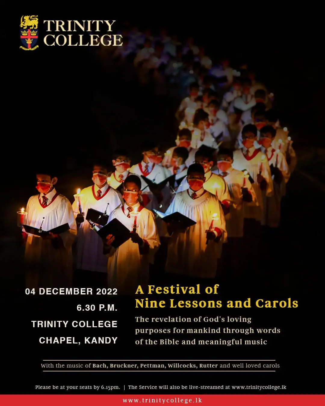 A Festival of Nine Lessons and Carols will be held on the 4th of December, 2022, 6.30 PM, at the Chapel of Trinity College Kandy.