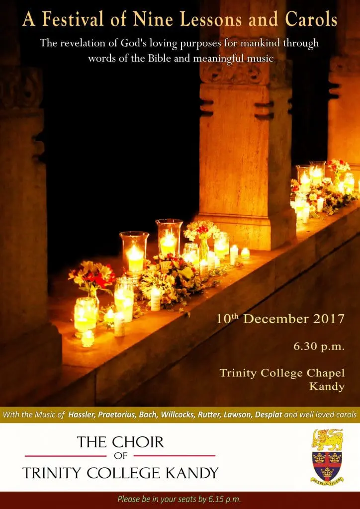 At Trinity College Kandy, there are records of Carol services from 1935. The “Festival of Nine Lessons and Carols” was held for the first time in 1958.