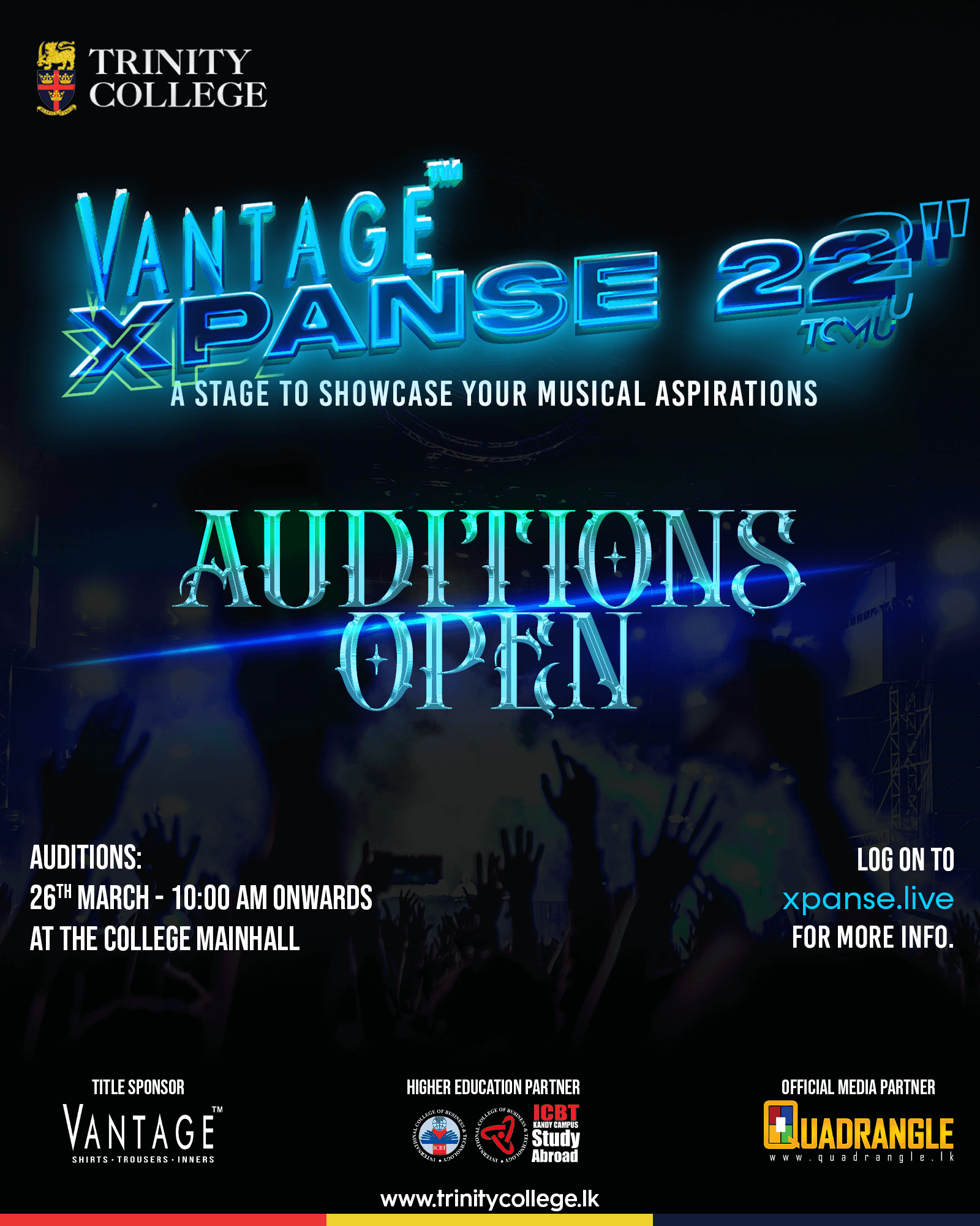 Xpanse '22 is a talent-based music concert organized by the Media Unit of Trinity College, Kandy. The auditions for said event is to take place on the 26th of March at the College Main Hall from 10:00 am onwards.